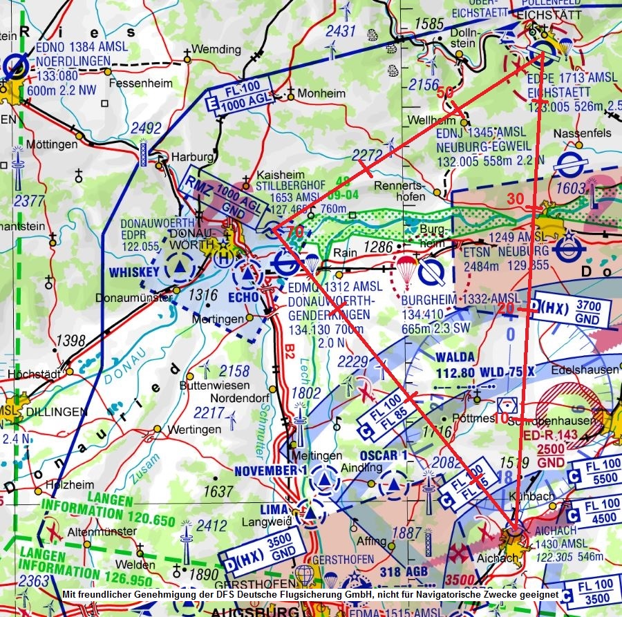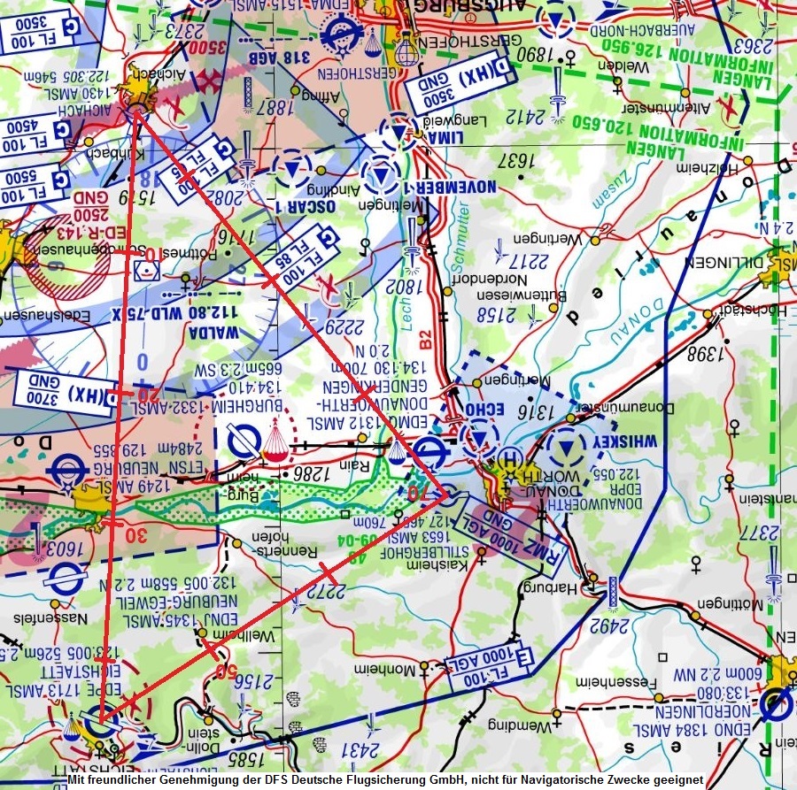Bei einem solchen Überlandflug bevorzugen viele Piloten, die Karte immer so zu halten, dass sich das Ziel oben, voraus befindet. Wenn dein Ziel nun beispielsweise von deinem Startpunkt aus gesehen im Süden liegt, wirst du feststellen, dass deine Karte auf einmal auf dem Kopf steht. Das ist zwar auf den ersten Blick etwas gewöhnungsbedürftig, aber du wirst mit der Zeit feststellen, dass es bequemer und praktischer ist, als sich die Karte im Kopf immer wieder umzudrehen.
