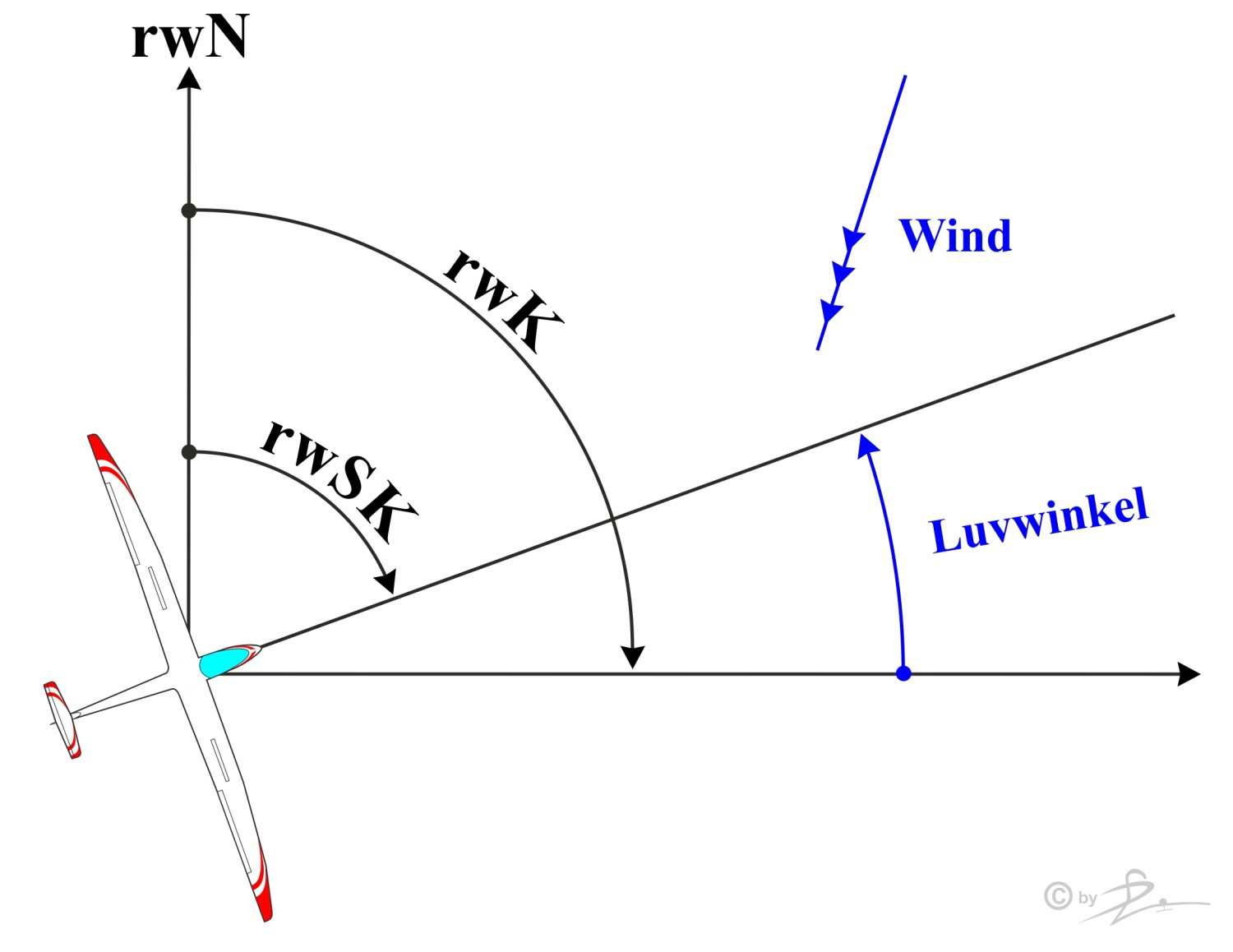 Um diesen Seitenwindeinfluss auszugleichen und den geplanten Weg über Grund auch tatsächlich zu fliegen, musst du gegen den Wind um den Luvwinkel vorhalten. Luvwinkel deswegen, weil du die Nase gegen den Wind, also auf die windzugewandte Seite (Luv) drehen musst. Mathematisch sind Abdrift und Luvwinkel nicht exakt gleichgroß (und haben außerdem immer entgegengesetzte Vorzeichen), in der Praxis können sie aber als gleichgroß angesehen werden.