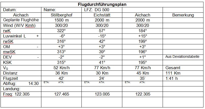 Als navigatorische und meteorologische Flugeinweisung wird ein Streckenflug mit einer DG 500 über die Strecke Aichach – Stillberghof – Eichstätt – Aichach geplant. Das Wetter aus PC-Met Toptask sagt gute Thermik mit einer Basishöhe von 2400m MSL voraus, QNH 1023 hPa. Die geplante durchschnittliche Reisegeschwindigkeit beträgt 70 km/h. Der Wind ist aus 300° und 20 km/h in 2000m vorhergesagt.