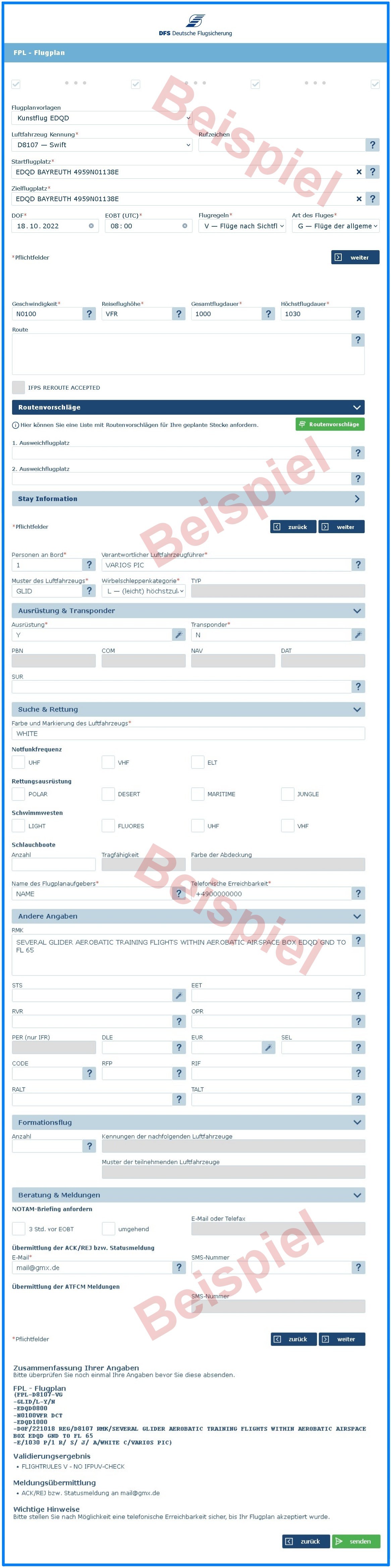 Hier siehst du als Beispiel ein Flugplan für Segelkunstflug in einem aktivierten Kunstflugraum über dem Flugplatz Bayreuth. Dieser ist so geschrieben, dass auf dem gleichen Segelflugzeug, hier ein Swift S1, ab 08:00z Kunstflug gemacht wird, und zwar von mehreren Piloten, die ca. 10 Stunden lang starten und trainieren wollen. Der Kunstflugraum ist bis FL 65 aktiv.