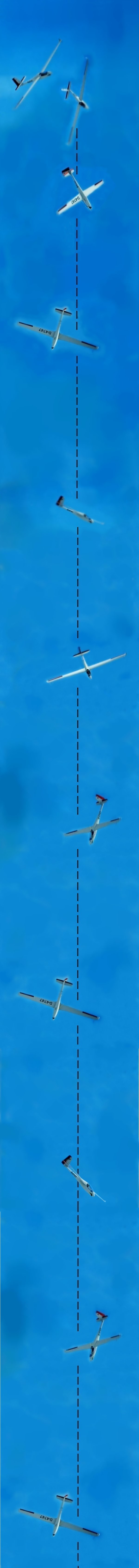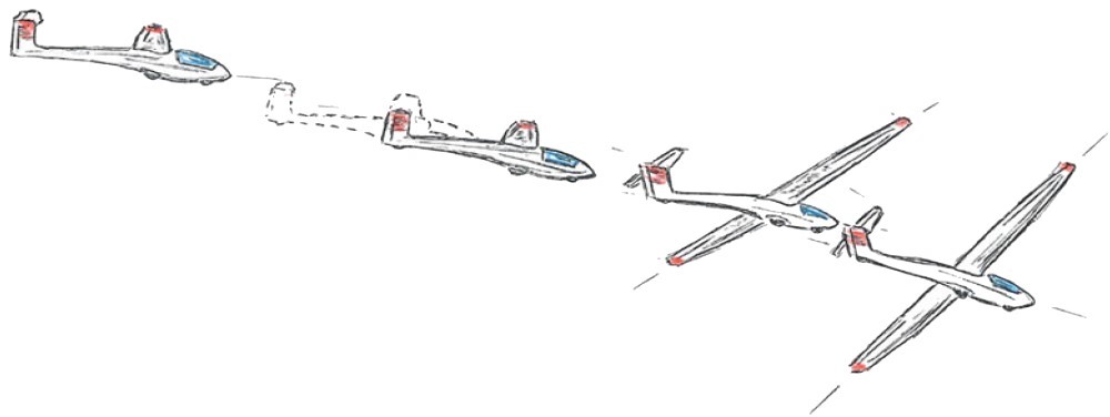 Horizontales Geradeausfliegen, kein Problem, das wirst du jetzt vermutlich denken. Du wirst jedoch lernen, dass die richtige Höhensteuerführung schwieriger ist, als es aussieht. Beim Segelkunstflug ist es wichtig, dass du gerade Linien fliegen kannst, sei es horizontaler Normalflug, im Rücken, in der Messerlage, in vorbestimmten Winkeln auf und abwärts, auch senkrecht nach oben oder nach unten. Nur so kannst du gewährleisten, dass du beim Einsatz eines weiteren Ruders, die gerade Richtung beibehältst. Eine ungewollte Richtungsänderung erfolgt schneller, als du denkst.