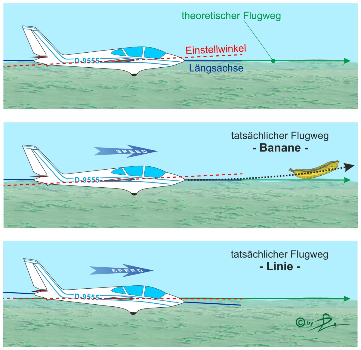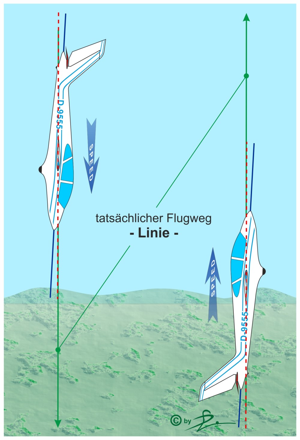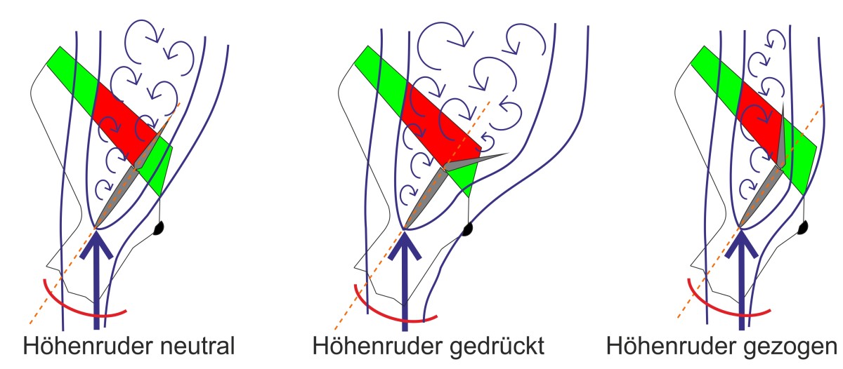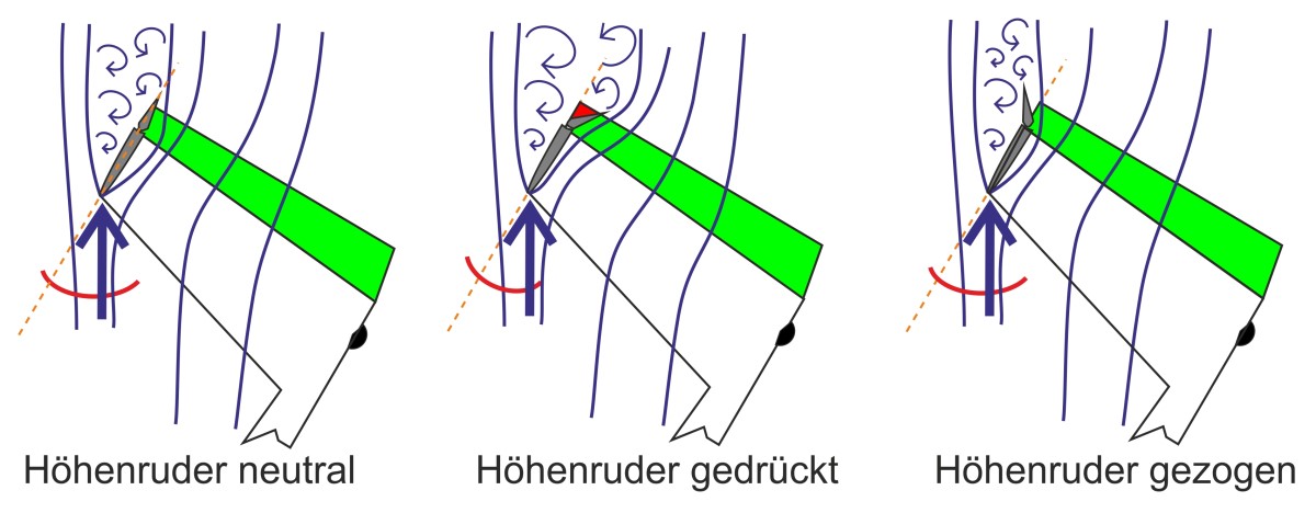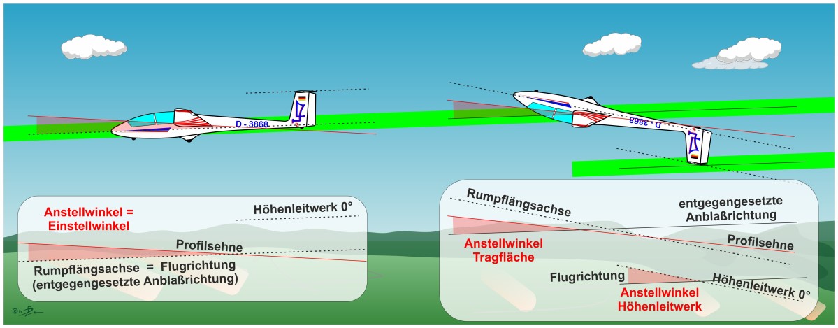 Es ist schon klar, dass der Flugweg eines Segelflugzeugs in Richtung Boden geht, wir haben ja keinen Motor, der uns horizontal fliegen lässt. Unsere Segler haben einen Einstellwinkel, der in etwa dem Anstellwinkel im unteren Geschwindigkeitsbereich entspricht, damit wir widerstandsarm mit entsprechendem Auftrieb schön segeln können, mal ganz banal ausgedrückt. In den Zeichnungen ist der Flugweg einfachheitshalber horizontal bei geringer Geschwindigkeit dargestellt, um die Stabilisierung der Linie besser erklären zu können.