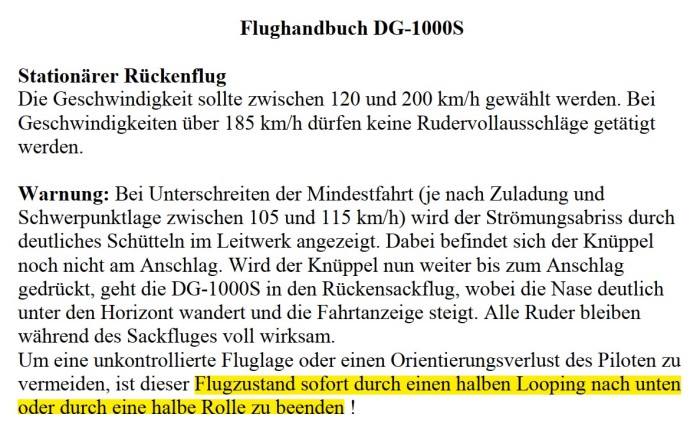 Jetzt ist schnelles Ausleiten angesagt. Du kannst, allerdings nur unter Mithilfe deines Kunstfluglehrers, durch kurzes, bewusstes Ziehen die Strömung zum Anliegen bringen und dann negativ abfangen. Jetzt entstehen aber negative "g". Bist du sicher, dass du wirklich im Rückensackflug bist und nicht mit hoher Geschwindigkeit nach unten rast, kannst du mit einem halben Loop in die Normalfluglage ziehen. Das gibt z.B. auch DG-Aviation in ihrem Flughandbuch der DGx1000S vor. |