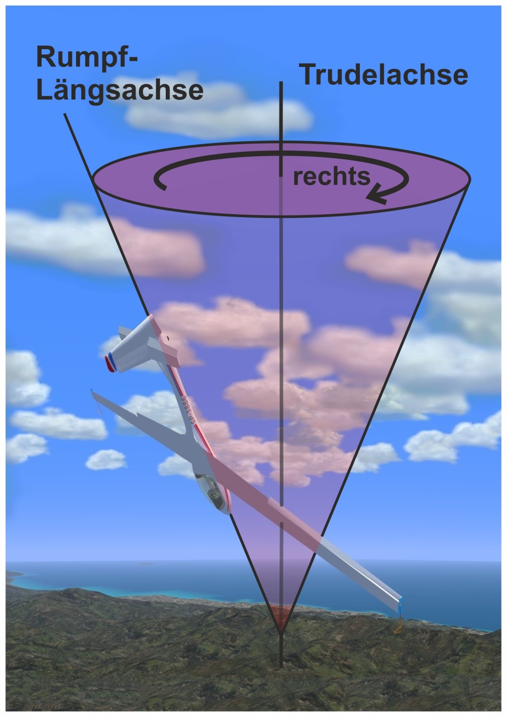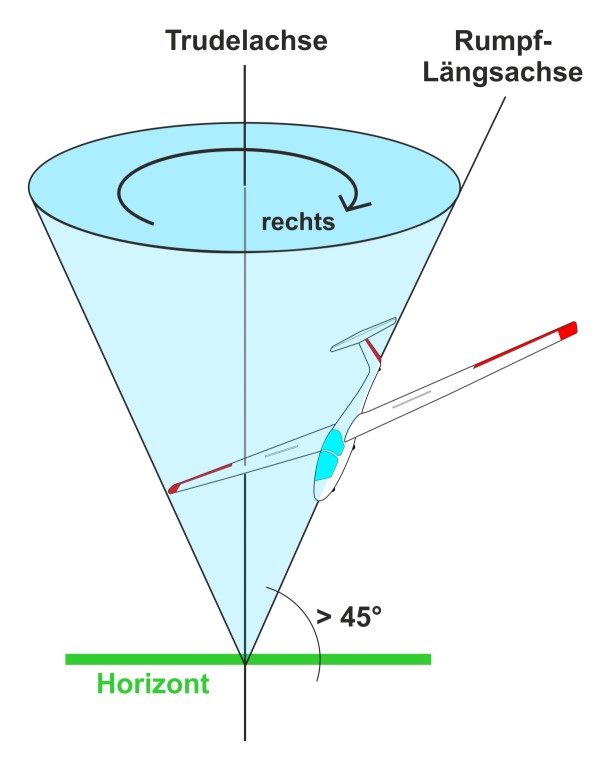 Trudeln, was ist das eigentlich? Es ist ein Rotationszustand, der durch einen wahnsinnig hohen Anstellwinkel im Innenflügelbereich, natürlich bezogen auf die Drehung und einem immer noch sehr hohen Anstellwinkel am Außenflügel (Rotationskraft durch eine asymmetrische Auftriebsverteilung) entsteht. Der Winkel der Flugzeuglängsachse zum Horizont ist kleiner als 90° jedoch größer als 45°, dein Segelflugzeug dreht sich ungesteuert, es autorotiert.