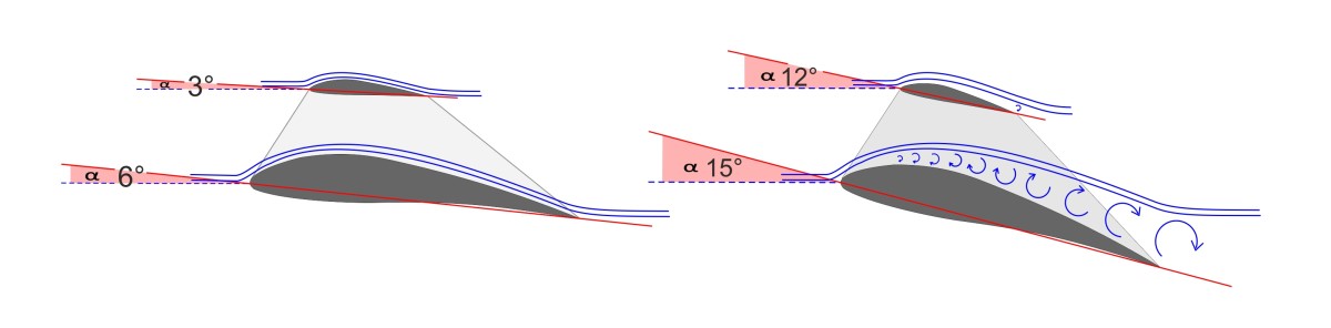 - Ein Strömungsabriss ist NUR vom Anstellwinkel abhängig, die Geschwindigkeit spielt eine untergeordnete Rolle.