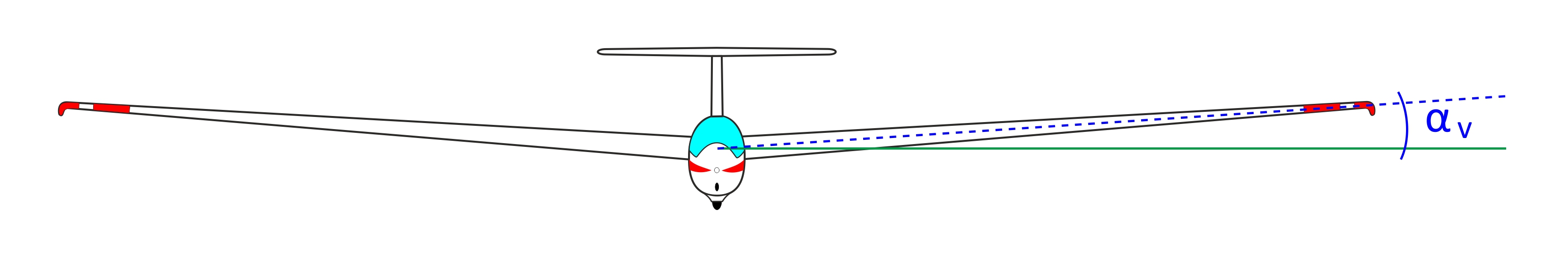 Die V-Stellung bezeichnet den Winkel, um den die eine Tragfläche gegenüber der Horizontalen aus der Richtung gekippt ist. In der Abbildung siehst du dies schematisch für eine ASK-21 dargestellt. Der V-Stellungswinkel ist mit αv bezeichnet.