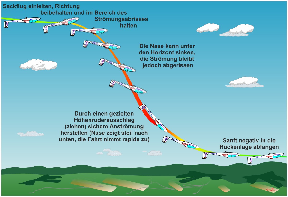 Die jedoch sicherste Methode, den Rückensackflug zu beenden, ist das Herausrollen. Erfahrungsgemäß wirken Quer- und Seitenruder im Sackflug noch ganz gut, du musst lediglich den Knüppel vom vorderen Anschlag nehmen, da bei "voll gedrückt", in Verbindung mit Richtungsrudern, die Gefahr des Rückentrudelns sehr groß ist.
