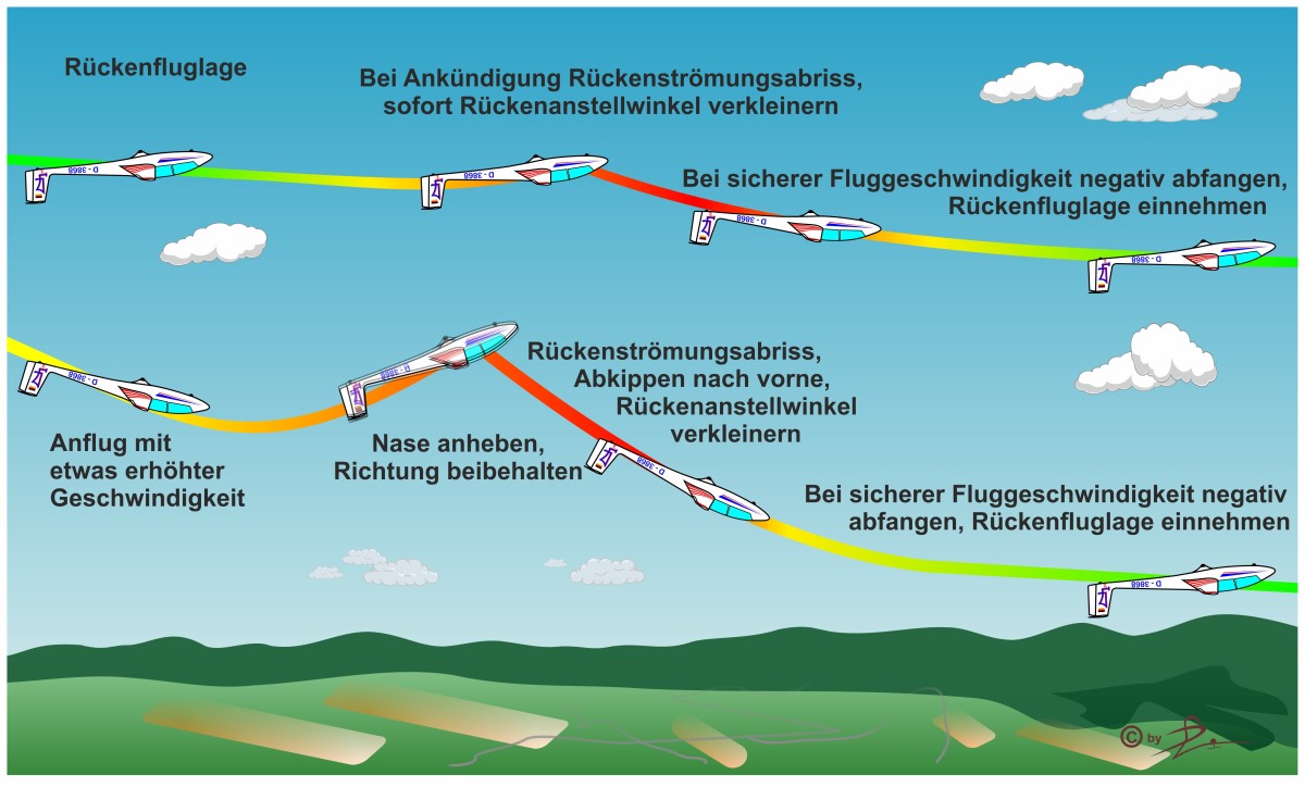 Lässt du jetzt das gedrückte Höhenruder (Tiefensteuer) nach, nimmt das Fahrtgeräusch zu, der Fahrtmesser schnellt nach oben, und jetzt kannst du durch vorsichtiges Drücken die "normale Rückenfluglage" einnehmen. Selbst bei einem etwas aggressiver geflogenen Abkippen, lässt sich der Zustand des normalen Rückenfluges problemlos herstellen, aber vorsichtig mit dem Höhenruder umgehen, die "second stall" Gefahr ist groß. Zu zaghaft ist jedoch auch nichts, du wirst das natürliche Mittelmaß schon finden.
