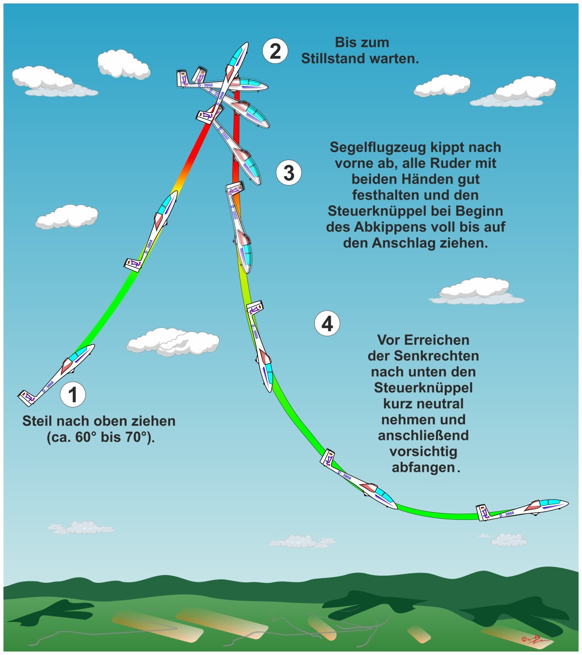 Deine Ausgangslage ist eine hoffentlich stabilisierte Linie mit ca. 110°x-x120°. Der Steuerknüppel wird festgehalten, der Ablauf ist wie beim Sicherheitsmännchen, nur eben nach hinten.