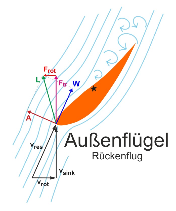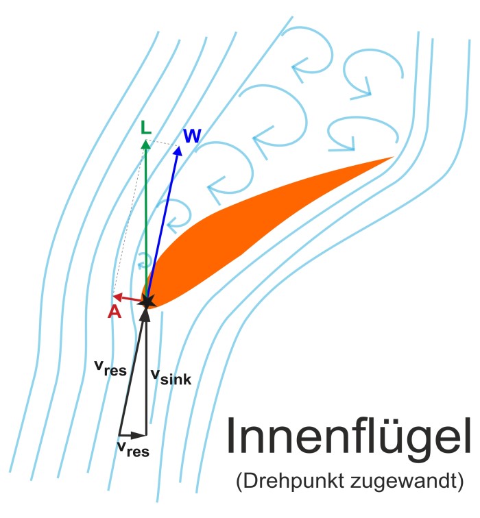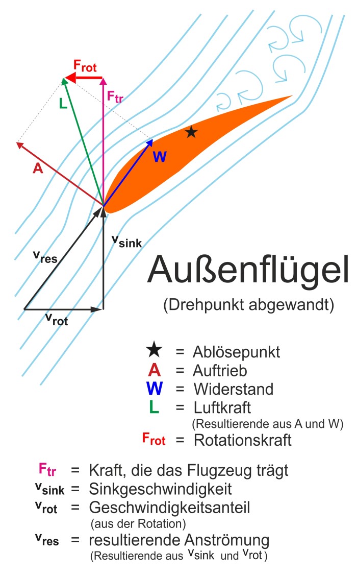 Der Anstellwinkel am Innenflügel ist wegen der Fallgeschwindigkeit und der Rückwärtsdrehung außen, mit gleichzeitiger Vor-wärtsdrehung innen, wahn-sinnig hoch. Am Außenflügel ist er durch die Fallgeschwindigkeit und die schnelle Vorwärts-drehung immer noch sehr hoch, es liegt aber zu-mindest teilweise Strömung an. Nun fragst du dich, woher diese Drehung (Rotation) kommt. |