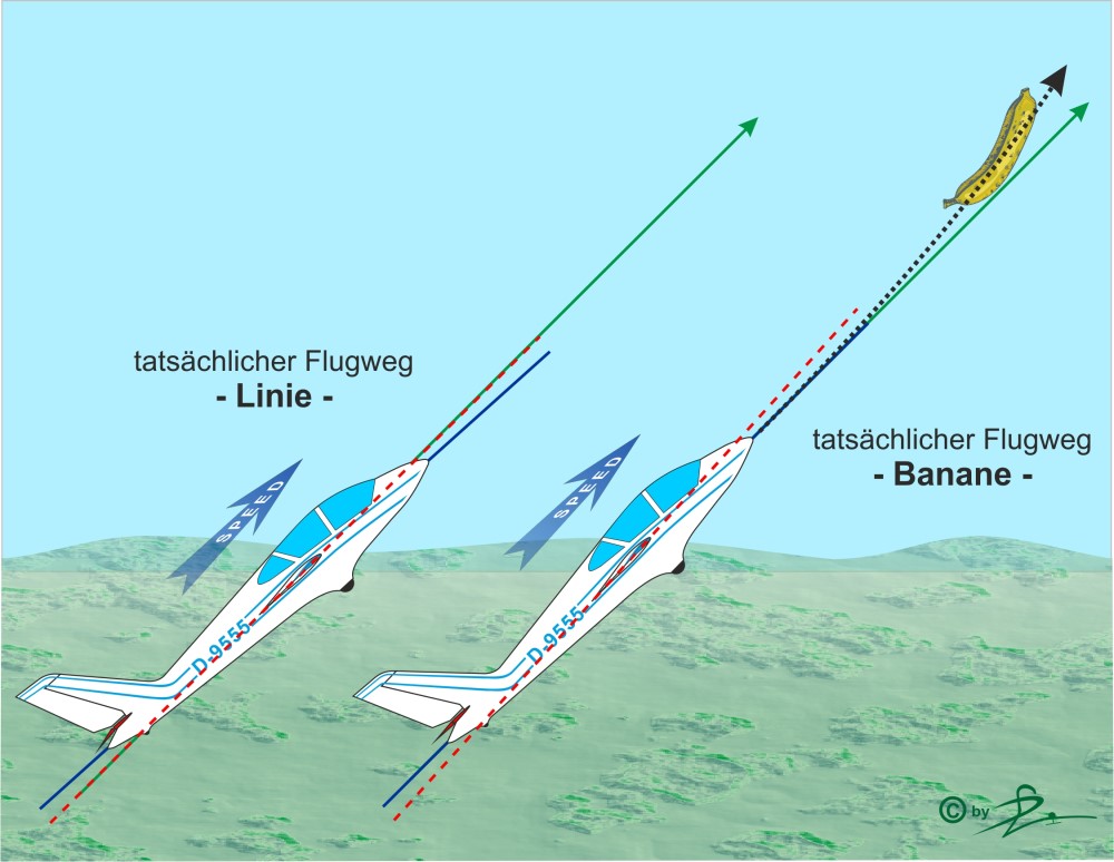 Ist deine Fluggeschwindigkeit (Pfeil speed) nun höher, egal aus welchen Gründen, musst du den entstehenden Mehrauftrieb durch Drücken kompensieren, du musst also zumindest mal den Einstellwinkelwert wegdrücken, je nach Profil auch mehr, sonst fliegst du einen Bogen. In der Internationalen Segelkunstflugwettbewerbsszene wird dieser Vorgang innerhalb der Schiedsrichter mit „Banana“ oder „great Banana“ bezeichnet und ergibt Punktabzug. Hörst du also bei irgendeiner „Kunstflugkritik“ das Wort Banane, weißt du was gemeint ist.