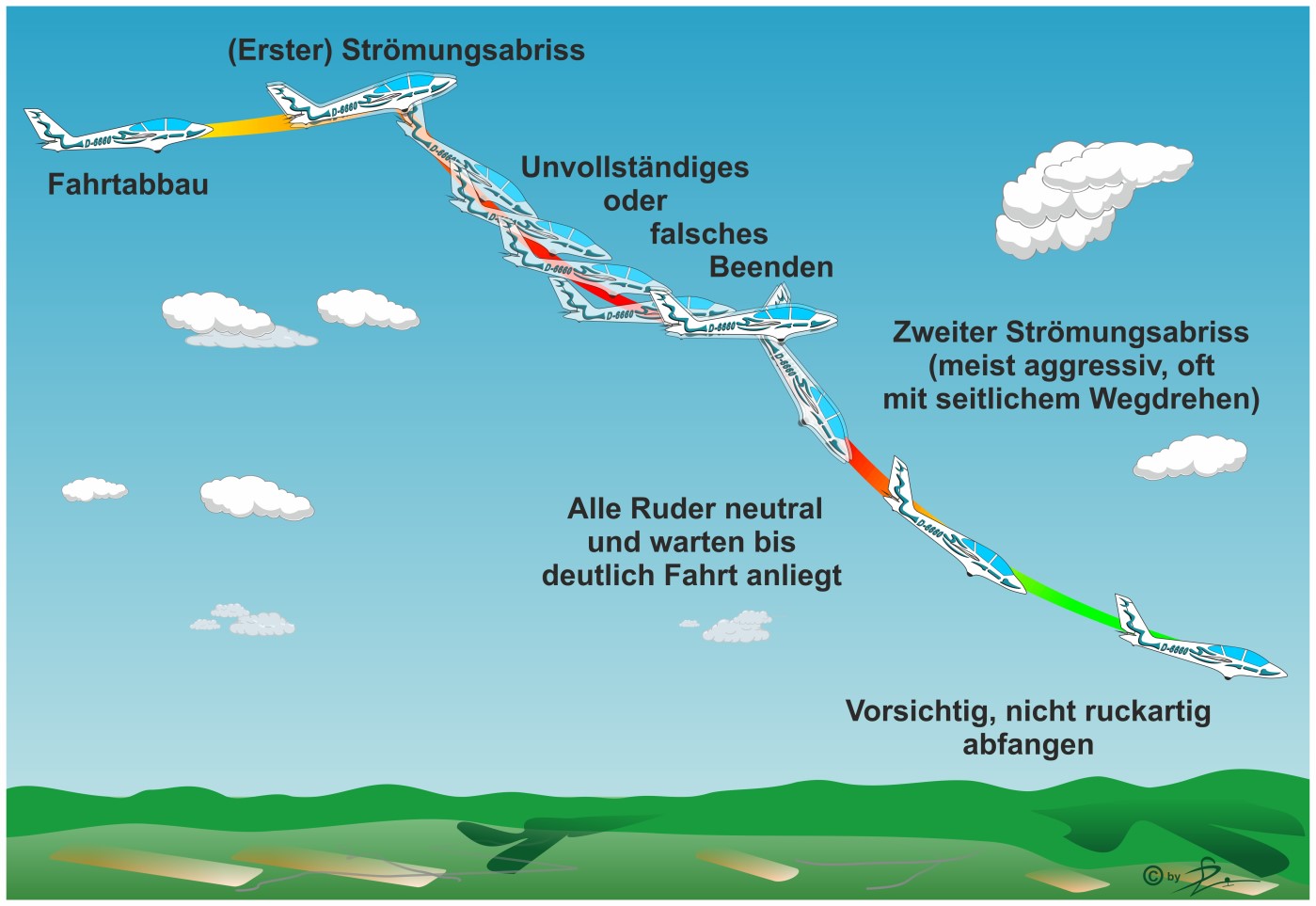 Solltest du irgendwann mal "neue Kunstflugsegler" ausprobieren dürfen, ist es immens wichtig, das "stall" Verhalten im Normal- und Rückenflug sowie das Trudelverhalten zu kennen, bevor du überhaupt an die erste Flugfigur herangehst.