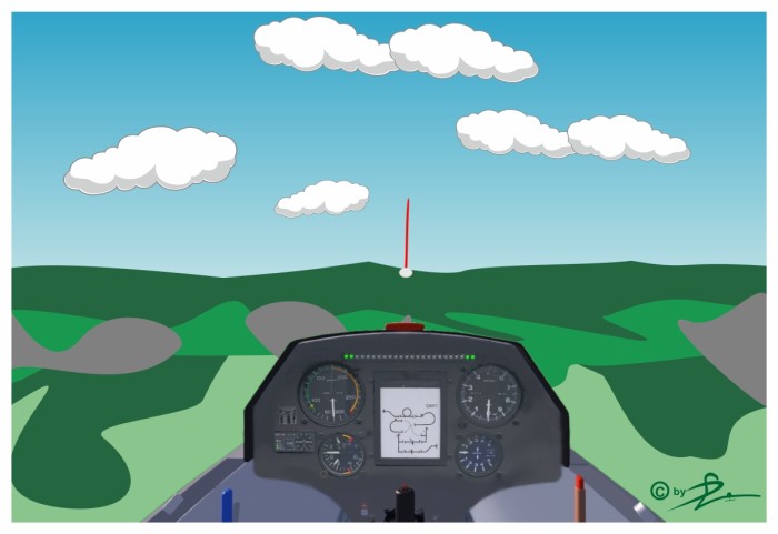 Jetzt bleibt dein Flieger in der steilen Fluglage oder sogar in der Senkrechten nach oben stehen. Es wird ruhig, du bekommst ein mulmiges Gefühl im Bauch und du weißt, dass dein Segelflugzeug eigentlich nicht zum Rückwärtsfliegen vorgesehen ist. Dennoch ist es aerodynamisch so schnittig, dass es, wenn es mal rückwärtsgeht, sehr schnell hohe Geschwindigkeiten erreichen kann; 100.-.150.km/h sind schnell erreicht.
