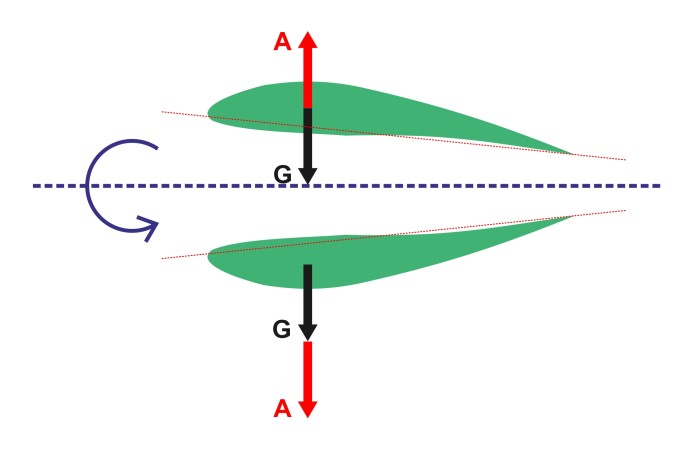 Üblicherweise ist dieser Wert bei Schulflugzeugen, wie der ASK-21, positiv, so dass beide Flächen leicht nach oben stehen. Du erkennst, dass der Kraftangriffspunkt der Auftriebskraft (A) durch die erhöhten Flügel oberhalb des Schwerpunktes liegt, an dem die Gewichtskraft des Flugzeuges wirkt. Die Auftriebskräfte haben wir aus Gründen der Anschauung etwas weiter außen angetragen, als sie tatsächlich wirken.