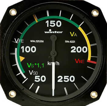 ist die Geschwindigkeit bis zu der ein einzelnes Ruder, unabhängig davon welches, voll ausgeschlagen werden kann ohne das Luftfahrzeug, in einem symmetrischen Flugzustand, strukturell zu überlasten. Die maximale Fluggeschwindigkeit VNE darf nicht überschritten werden.