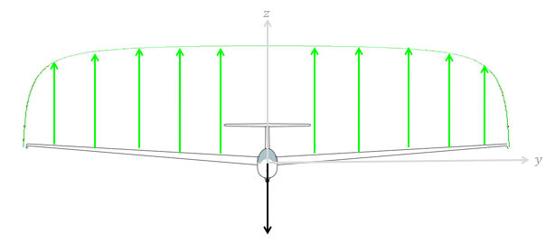 Der Anteil in spannweitiger Richtung (y-Wert) liegt immer sehr nahe an der Symmetrieebene des Flugzeugs und erzeugt damit keine oder nur sehr kleine Momente. Segelflugzeuge sind üblicherweise in Tandemanordnung (Pilotensitze hintereinander) konzipiert. Somit unterliegt diese Größe auch keinen Änderungen im Laufe des Flugbetriebs.