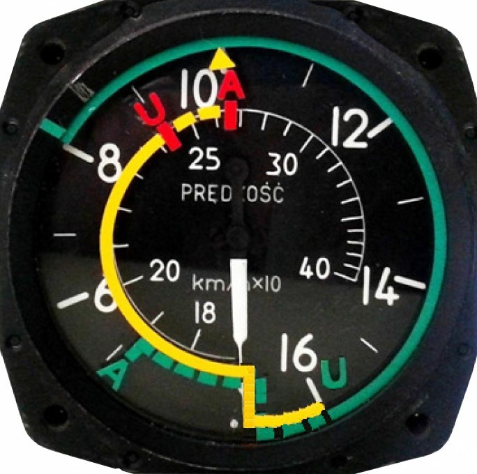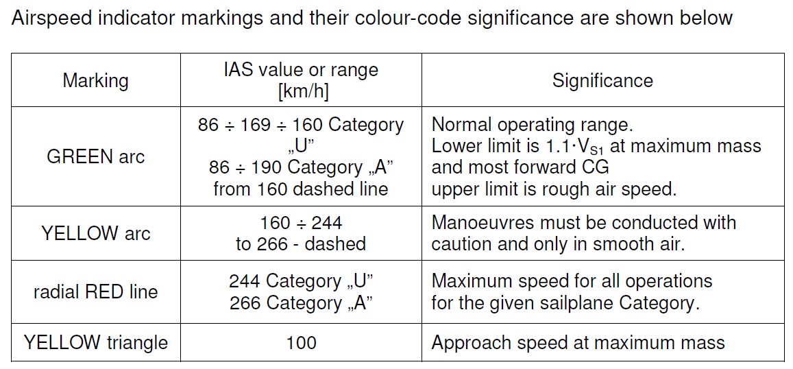 Hier siehst du die Fahrtmessermarkierungen, welche die einzelnen Geschwindigkeitsbereiche anzeigen. der obere Fahrtmesser ist aus dem Kunstflugsegler SZD 54-2 Perkoz (Haubentaucher) und wir können uns vorstellen, dass du hier in deutschen Segelflugzeugen diese, etwas exotisch wirkende Art der Markierungstechnik eher selten gesehen hast. Das Geheimnis sind die unterschiedlichen Betriebsgrenzen in denen der Perkoz geflogen werden darf. In der "U" Zulassungsklasse hat er 20 m Spannweite und als Segelkunstflugzeug (unlimited oder früher Vollacro) hat er "nur" 17,5 m. Der untere Fahrtmesser dürfte dir vertraut sein.
