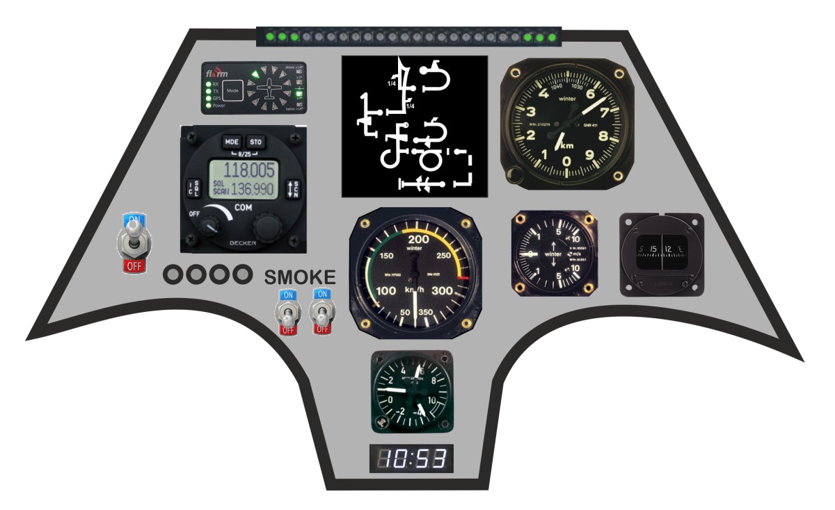 Es ist für Rechtshänder ausgelegt. Den Hauptschalter, das Flarm, den Funk, die Sicherungen und die Rauchanlage kannst du mit der linken Hand bedienen und währenddessen mit der rechten Hand steuern.