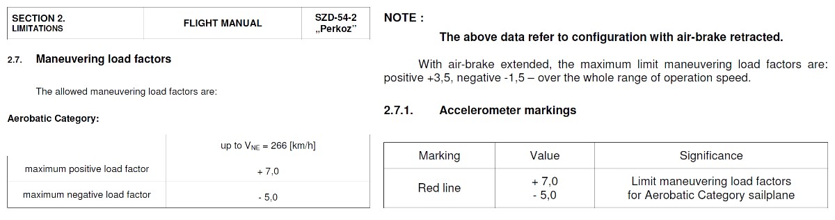 | SZD 54-2 Perkoz 17,5 m | + 7 g | + 7 g | - 5 g | - 5 g |