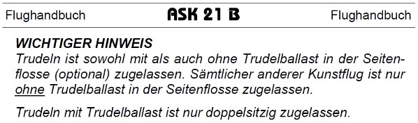 Auch solltest du wissen, dass sich die maximalen Lastvielfachen mit ausgefahrenen Bremsklappen deutlich reduzieren. Die findest du im Flughandbuch (z.B. ASK 21 ±.0xbisx+.3,5.g), die derzeit gültigen Mindestforderungen sind:
