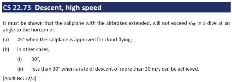 Diese veraltete Forderung wurde mit der EASA Explanatory Note to Decision 2021/013/R abgeschafft und die derzeit gültige CS.22 fordert diesen Sturzwinkel nur noch für die Zulassungen Wolkenflug. Alle anderen müssen den 30° Sturz-winkel mit Bremsklappen einhalten. |