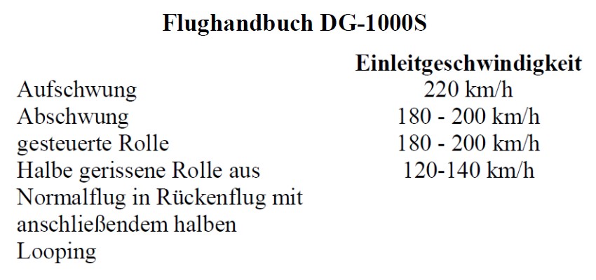 Zur DG 1000 ist zu sagen, dass du sie minimal schneller fliegen musst als die ASK 21, das liegt aber unter anderem auch am Tragflächenprofil. Die Geschwindigkeitsangaben von DG-Aviation sind bezüglich der Kunstflugfiguren auf alle Fälle sehr realistisch.
