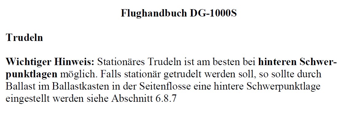 Solltest du dich nun fragen, warum in den Notverfahren das Ausleiten des Trudelns so exakt beschrieben wird, obwohl du gemäß Flughandbuch nicht trudeln darfst, lautet die Antwort ganz einfach. Es liegt kein beabsichtigtes Trudeln vor. Mit den heutigen Kunststoffbombern, stell dir einfach mal einen Nimbus 4 vollgepackt mit Wasser vor, kannst du beim Ausleiten des Trudelns schon bis an die zulässigen Betriebsgrenzen herankommen und sie evtl. überschreiten, besonders bei Ausleitverfahrensfehlern, aber eine gründliche Überprüfung in einem LTB, sofern dir der Flieger nicht vorher in der Luft zerplatzt ist, kommt immer noch besser, als der zwangsläufig der Erdanziehungskraft geschuldete Einschlag!!!